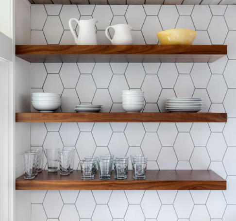 that is a simple, clean look or go with accent tile that creates a piece of art on your walls.
